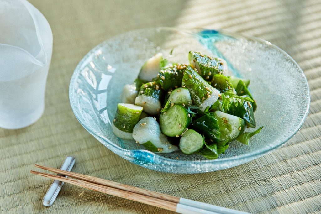 「しそかをり巻」に切ったきゅうりを合わせ、刻んだ大葉と塩を振り、ごま油をかけて混ぜれば出来上がり。みずみずしい胡瓜と胡麻と一緒に食べると、シャキシャキぷりぷりっと、なんとも爽やか。この一皿で野菜も、魚たんぱくもたっぷりいただけます。