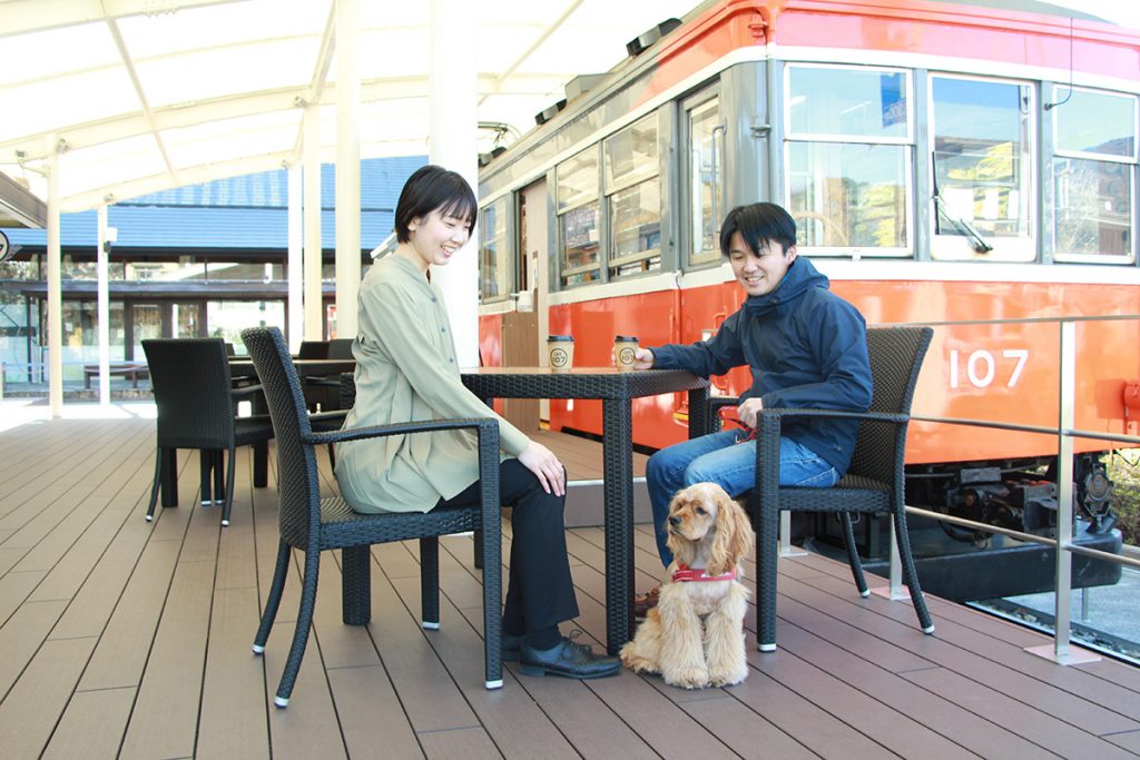 特にテラス席は箱根登山電車107号を間近で見ることができる、まさに特等席。開放的な席でのびのびとお過ごしいただけます。席の間隔に余裕があるので、ペットと一緒でもお隣に気を遣うこともございません。