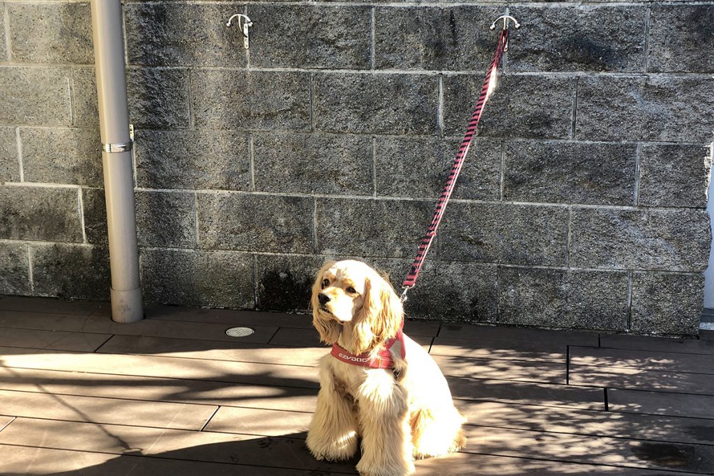 テラスの奥にはリードをかけるフックをご用意しております。席の近くにつないでおけるので、ご主人の側にいられてワンちゃんも安心。パートナーと一緒にリラックスした時間をお過ごしいただけます。