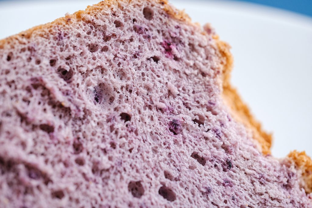 「お陽さまのシフォン ブルーベリー」は果実のホールとピューレをつかっておつくりしています。シフォンの柔らかな青紫色はブルーベリー本来の自然由来のもの。切ると所々に粒々とした果肉が顔を出します。