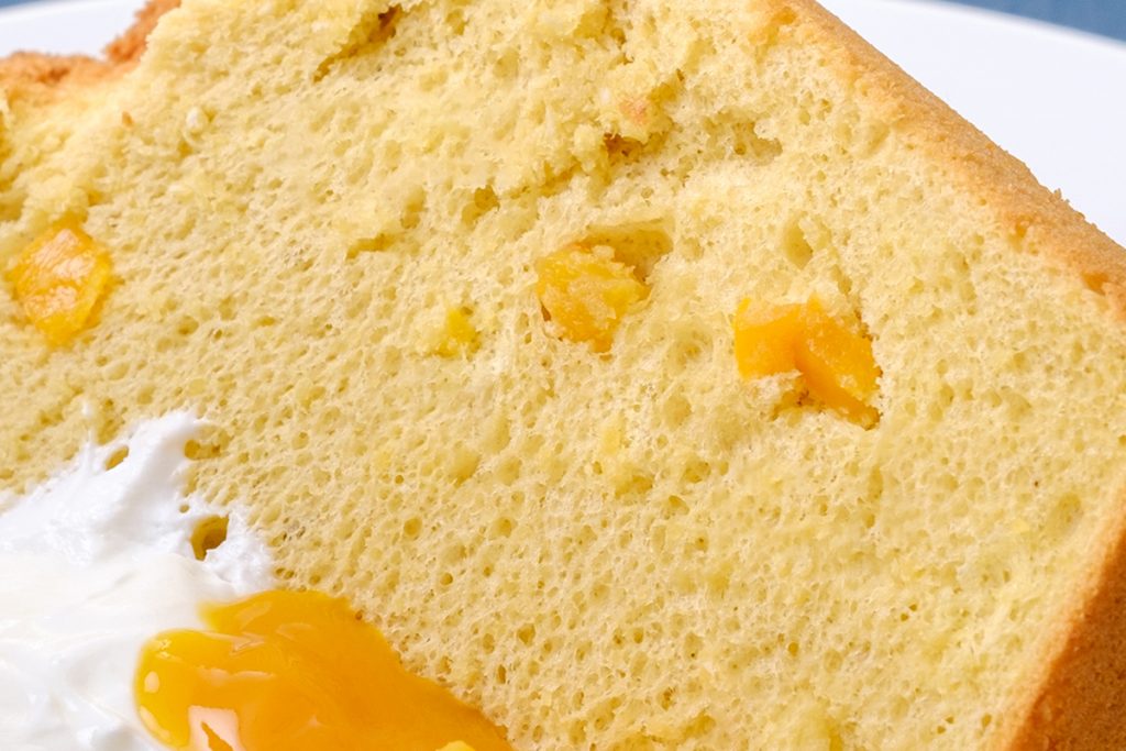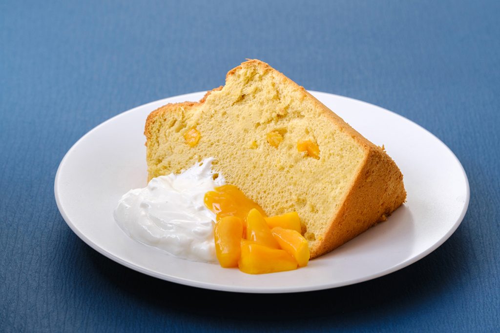 夏らしさを感じられるマンゴーのシフォンは、アイスクリームやフレッシュなフルーツを添えて召し上がっていただくのがおすすめです。