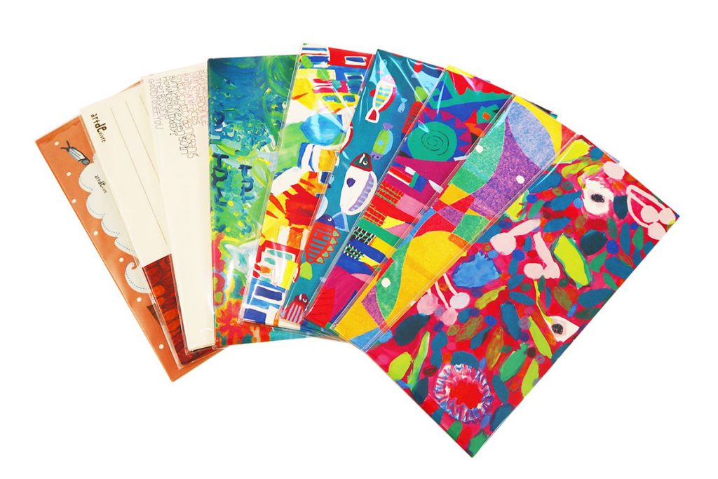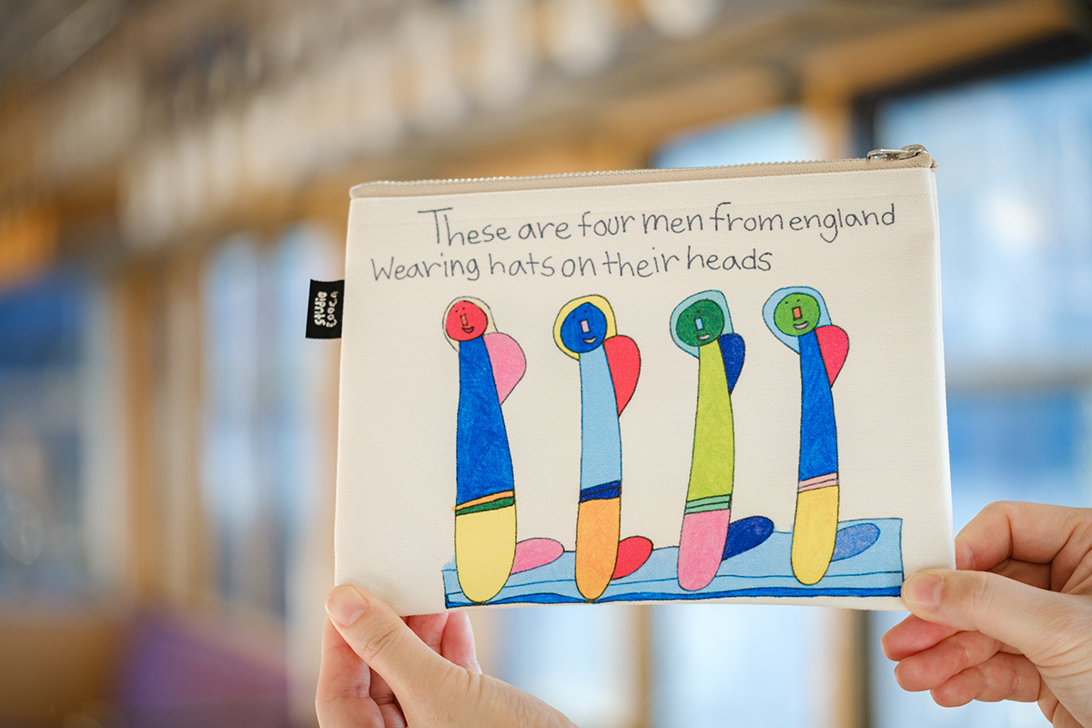 アトリエは小田原の森林が多い久野地区にあり、アーティストのみなさんは散歩や外遊びをしながら創作されているといいます。そんな楽しそうな空気が伝わってくる作品が魅力です。今回は原画のほか、一筆箋、ペンケース、バッグなど、身近に使えるアイテムをご用意しております。