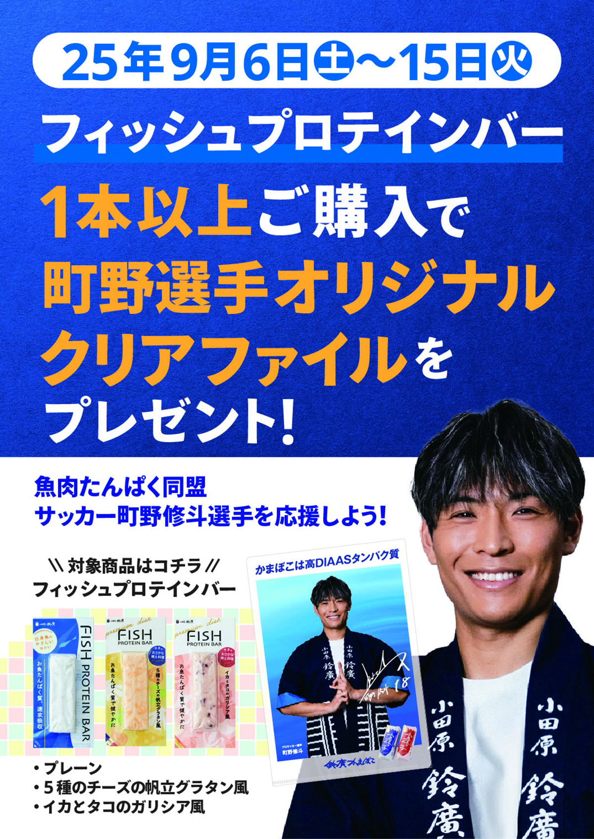 9月6日~15日の期間中、フィッシュプロテインバーを1本以上ご購入でプロサッカー・町野修斗選手のオリジナルクリアファイルがもらえるキャンペーンを実施いたします。鈴廣かまぼこ大使でもある町野修斗選手をともに応援しましょう!