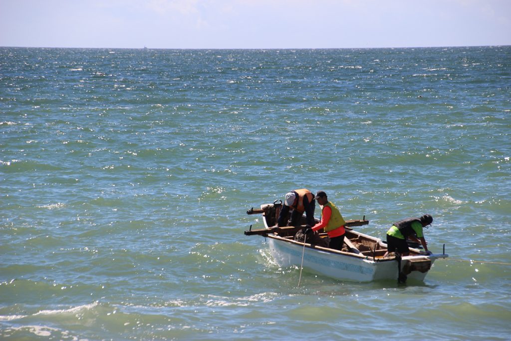 地引網漁とは、網の両端についたロープの一方を海岸に固定し、船を走らせながら網を仕掛け、もう一方のロープを海岸に持って帰ります。そして二手に分かれて両方のロープを引き、網に入った魚を漁獲します。
