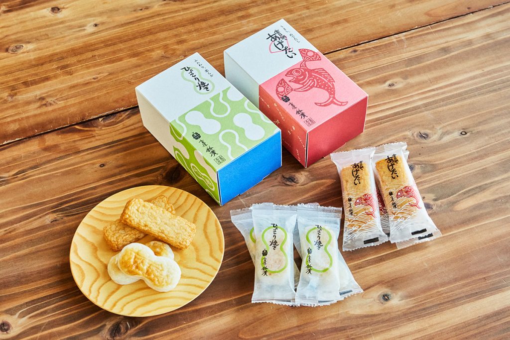 〇「ひょっこり焼き」:すり身に豆乳を加え、やわらかくもちもちとした食感が魅力です。縁起物のよいひょうたん形をしております。