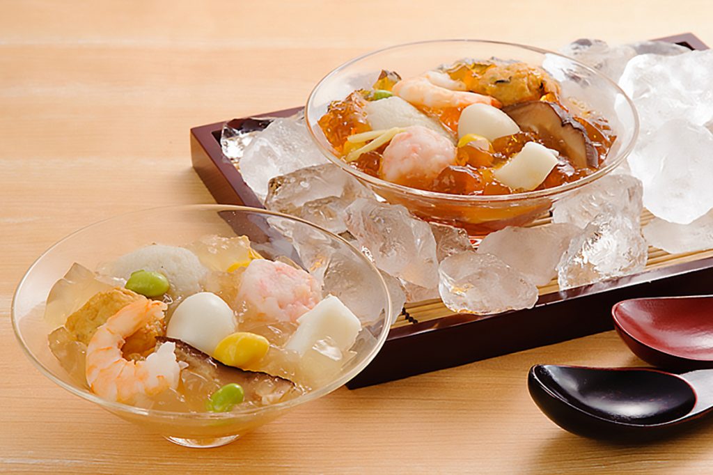 「冷やしおでん」はかまぼこや海老、椎茸や銀杏などの具材を出汁ジュレでつるりと召し上がっていただく一品です。そうめんや冷やし中華麺にかければ贅沢なお食事にもなります。