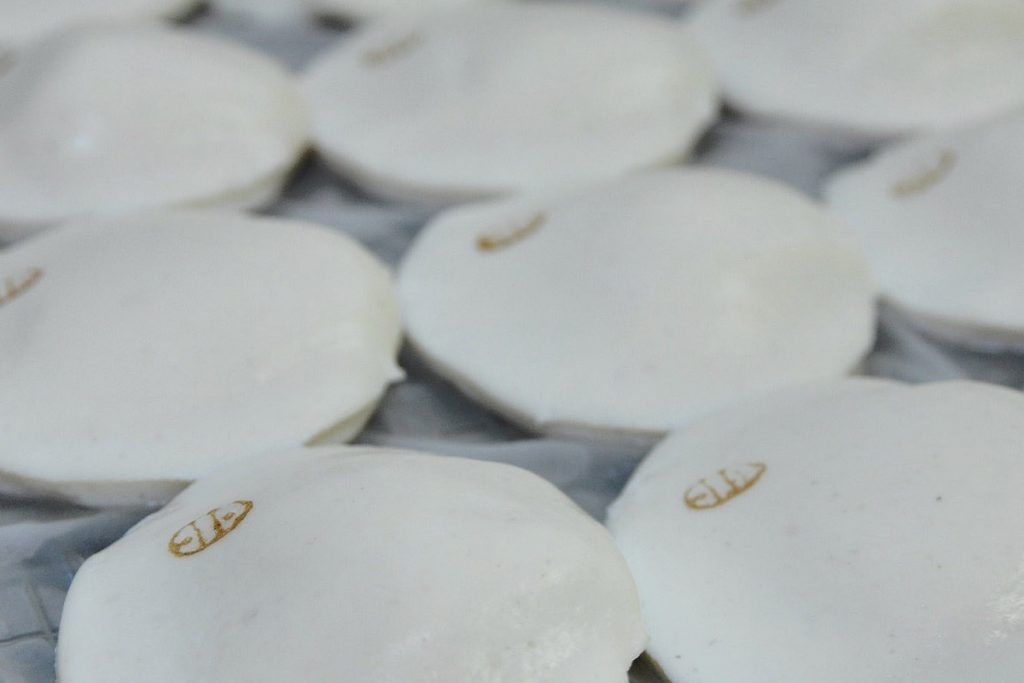 天然のグチのすり身に箱根の天然水と卵白を贅沢に加え、たっぷりの蒸気でふっくらと蒸しあげます。とても柔らかいすり身であるため、形どるのも、弾力を引き出すのも高度な技が不可欠です。かまぼこ職人が一枚一枚丁寧に手作業でおつくりします。