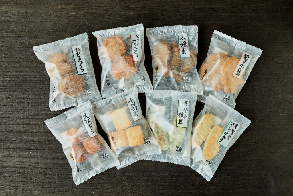「お好み十選」は一口サイズのかまぼこが入った小袋商品です。「コーン・ホタテ」「ねぎまぐろ」「ピリ辛なんこつ」など10種類の味わいを用意しました。