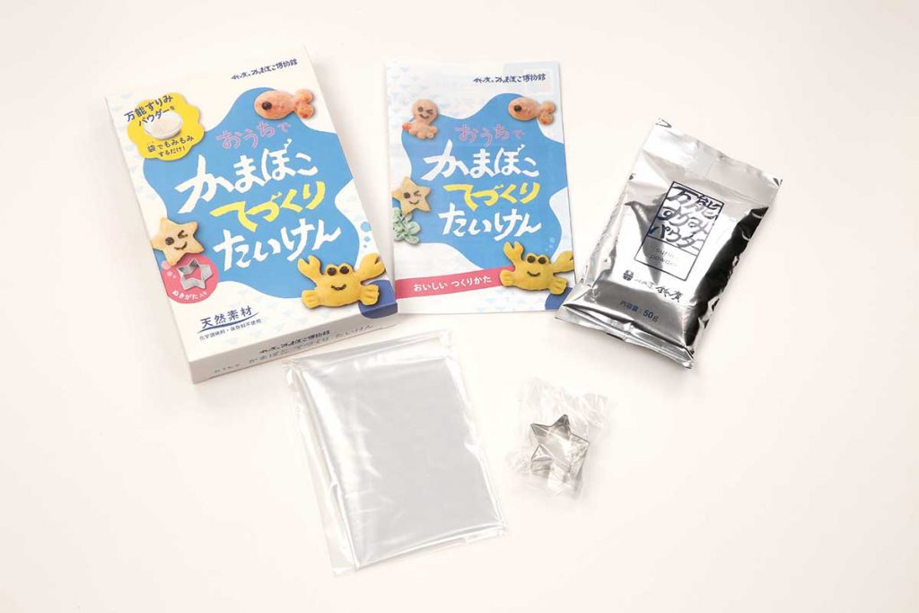 おうちでかまぼこを作ることができるキットです。水を加えるだけでお魚のすり身ができる「万能すりみパウダー」に、レシピと星の抜型、すり身を練る時に使えるビニール袋がセットになっています。