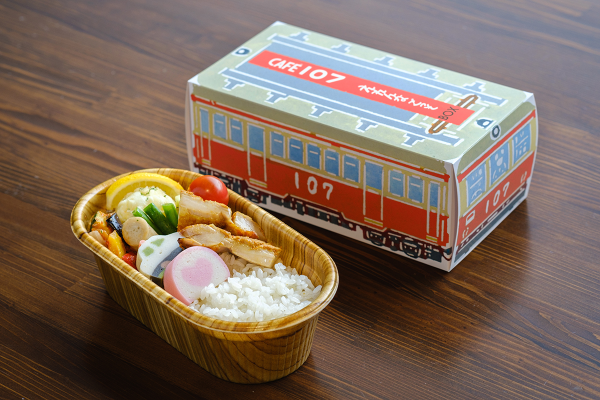 かまぼこの里のバイキングレストラン「えれんなごっそ」のメニューから好きなおかずを選んで、オリジナルのお弁当を作ります。箱根登山電車107 号オリジナルデザインのお弁当箱でお持ち帰りいただけます。