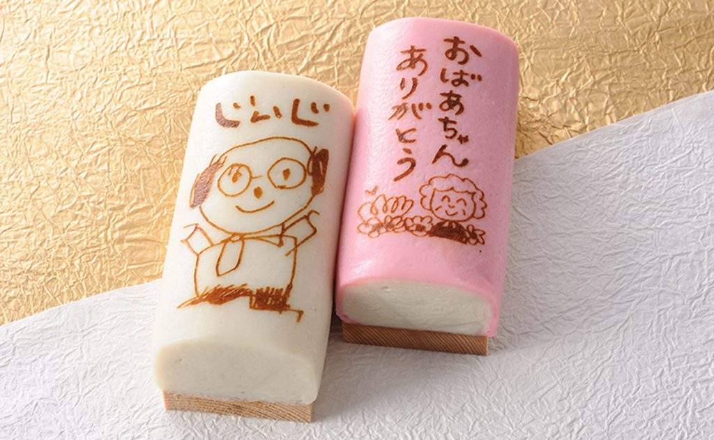 かまぼこに伝えたいメッセージやイラストをプリントできる「プリかま」。手描きの絵や日頃の感謝の気持ちなどを伝えられるので、大切な人への贈り物として人気の商品です。お孫さんが描いたお祖父様、お祖母様への似顔絵やメッセージは、手書きの文字にぬくもりを感じていただけます。