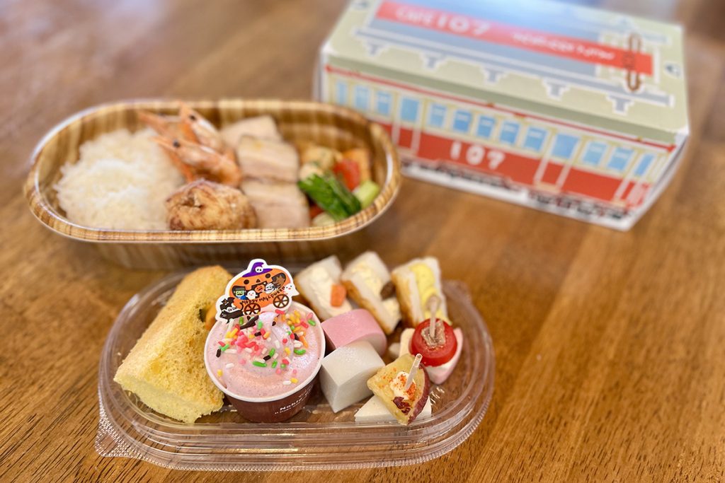 出来上がったお弁当は、箱根登山電車107号のお弁当箱に詰めてお持ち帰りを。秋晴れの日は、近くのカフェやテラスで召し上がっていただくのもおすすめです。