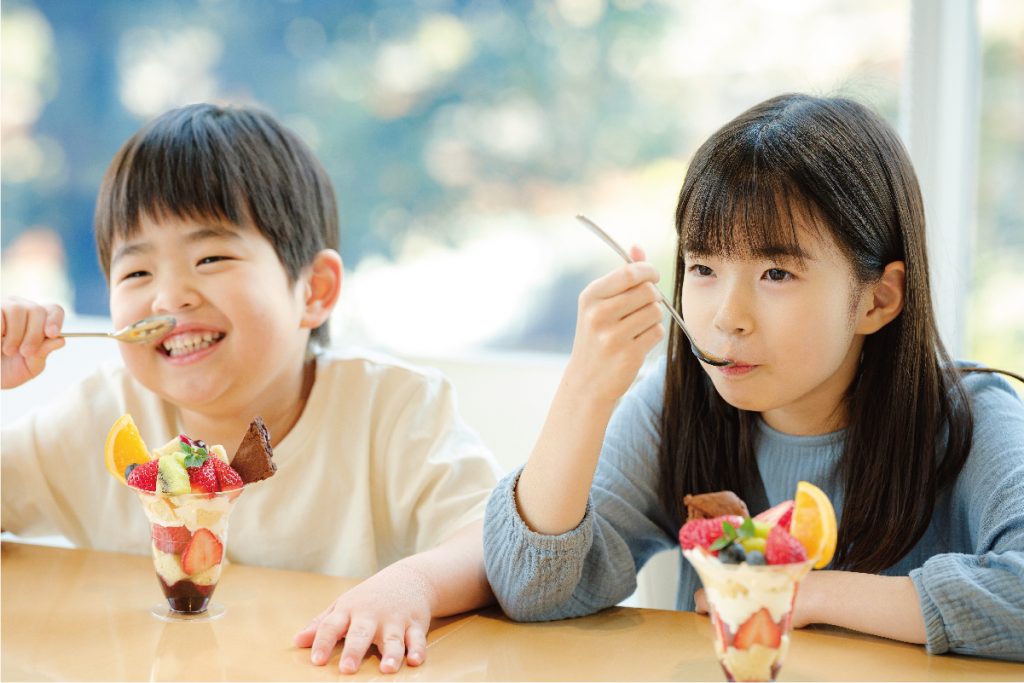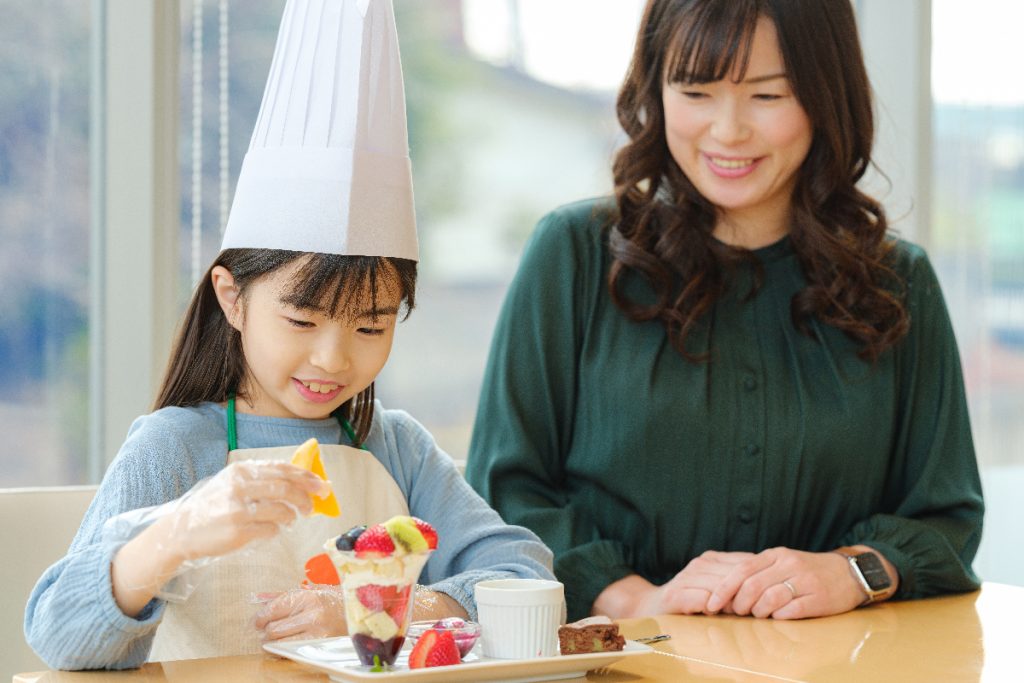 お子さまにはパティシエ帽をかぶっていただき、フルーツパフェづくりに挑戦していただきます。