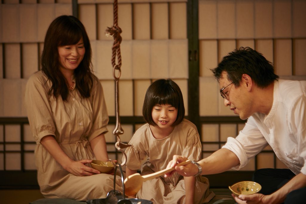 大清水名物のひとつは〆のご飯。土鍋に新米、旬の食材、そして名水「箱根天然水」をいれ、ふっくらつややかに炊き上げます。囲炉裏の前でほくほくアツアツをどうぞ。