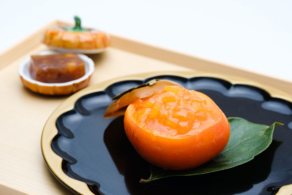 柿の器の中にはヨーグルトゼリーと完熟の柿をこんもりと。柿を一度凍らせることで、干し柿のようなとろ~り濃厚な甘さを引き出しています。つけあわせの温かな柿羊羹もどうぞ一緒に召し上がれ。