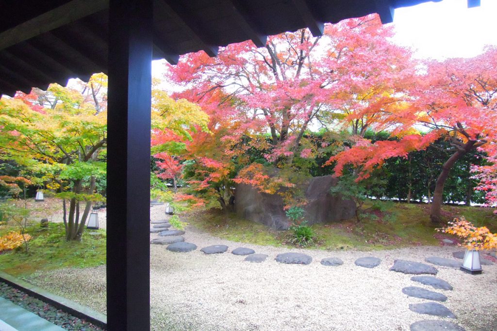 「名水甘味 且座」から臨むお庭の様子。紅葉を眺めながら、名水仕立ての甘味をどうぞ。