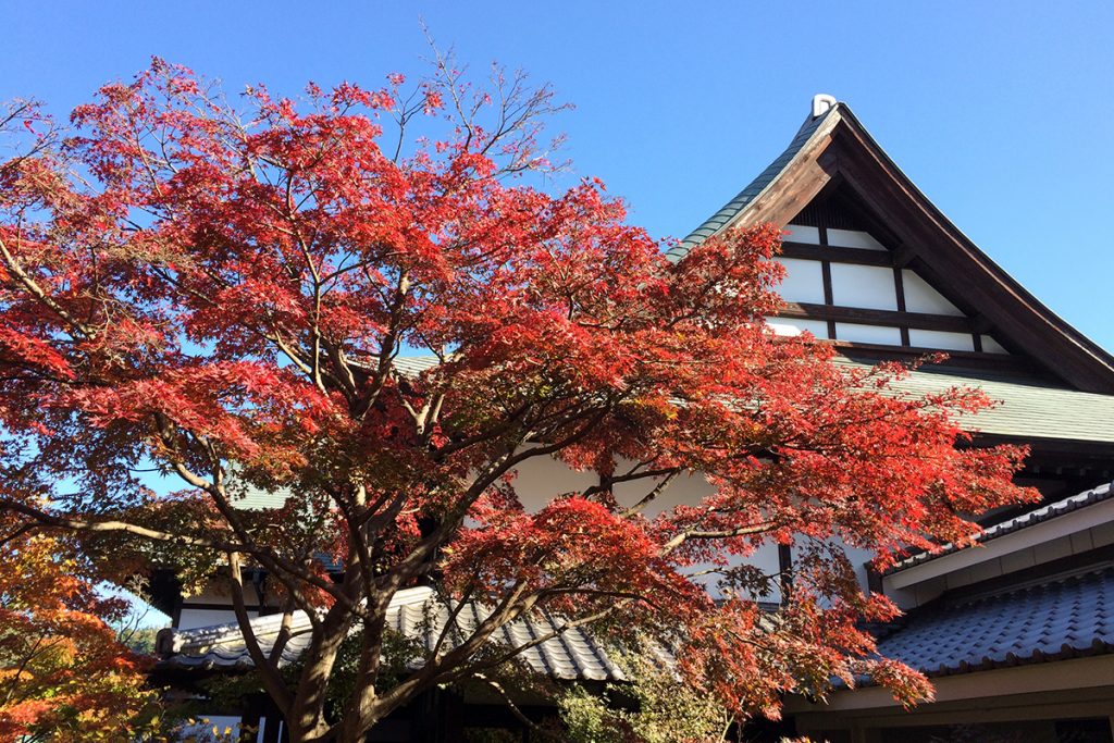 紅葉の庭で、秋空を見上げる