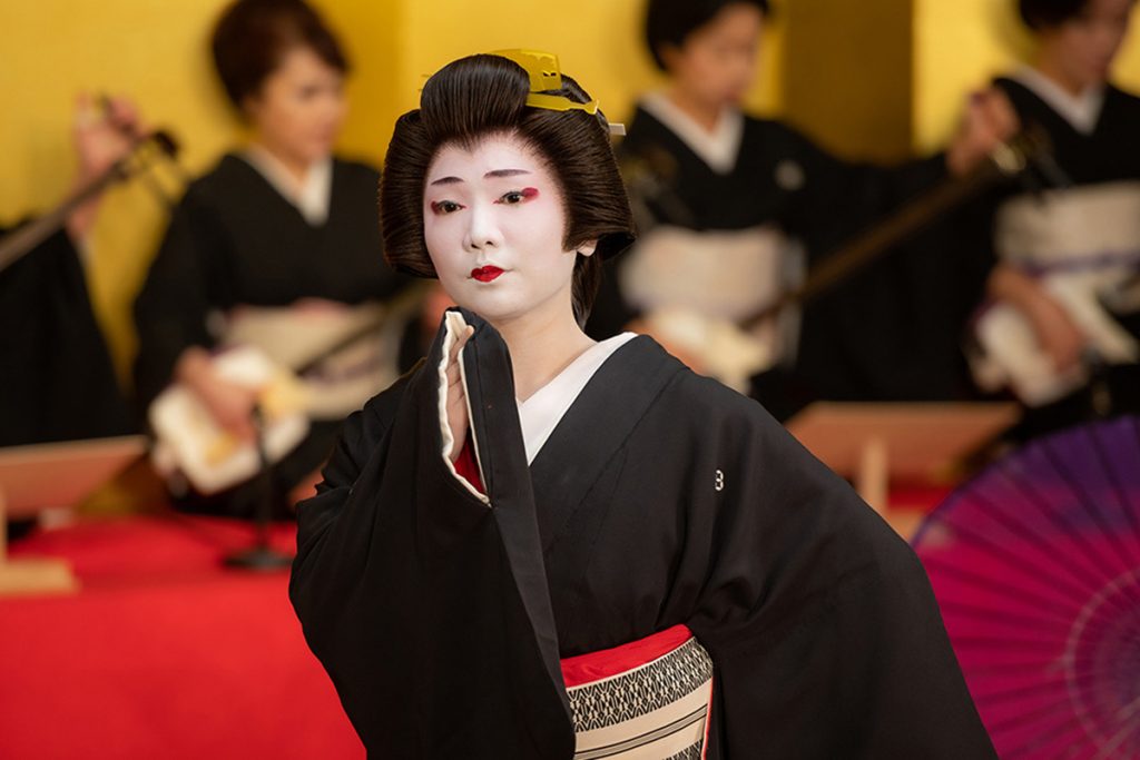 芸者さん方には箱根湯本よりお越しいただきます。箱根湯本では100名以上の芸者さんがいらっしゃり、宴席やお座敷にて舞踊や鳴り物(三味線、笛、小鼓、太鼓)、唄を披露し、芸者遊びなどで宴を盛り上げています。
