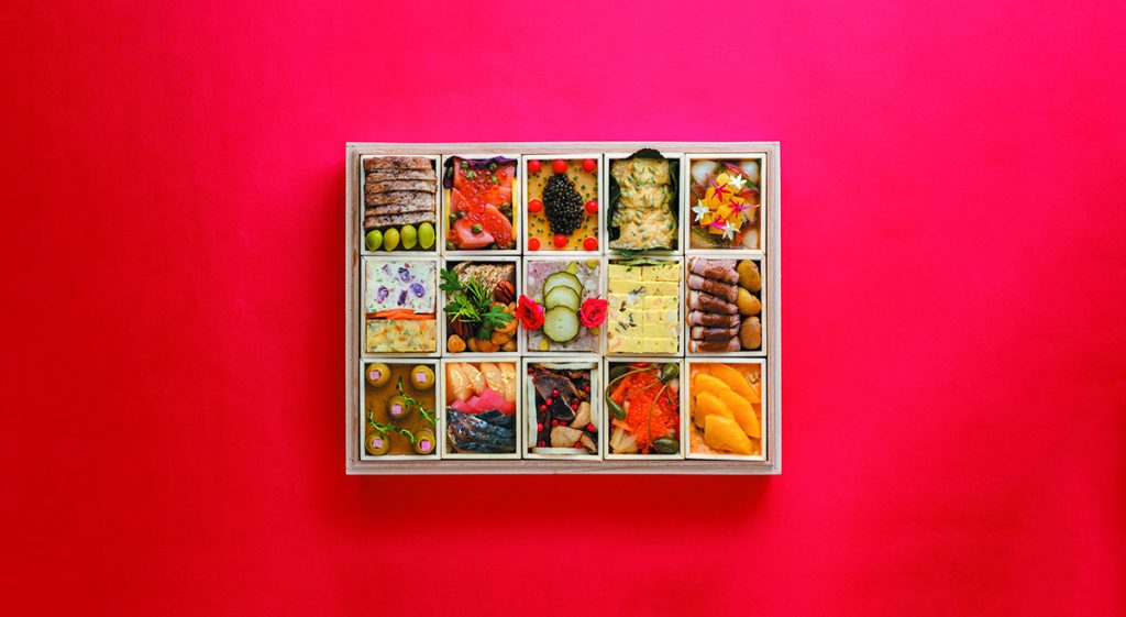 超特選蒲鉾鹿の子、超特選伊達巻古黄、鶏松風焼、キンキ幽庵焼、からすみ、栗きんとん、柚子釜入り紅白なます、六方くわい他