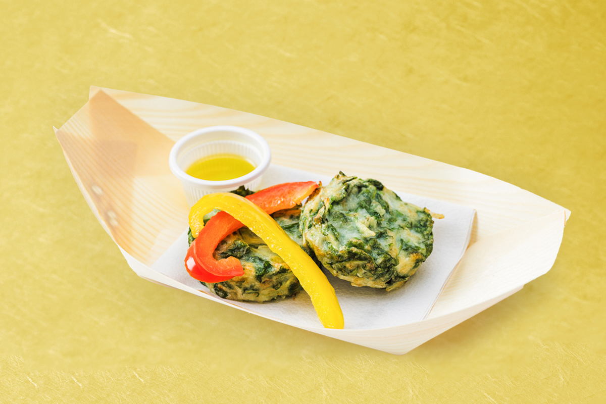 瑞々しい静岡産の水菜をすり身に混ぜ合わせて揚げた一品。すり身のプリっとした食感と水菜のシャキシャキ感が絶妙に合わさります。お好みでオリーブオイルをかけて。