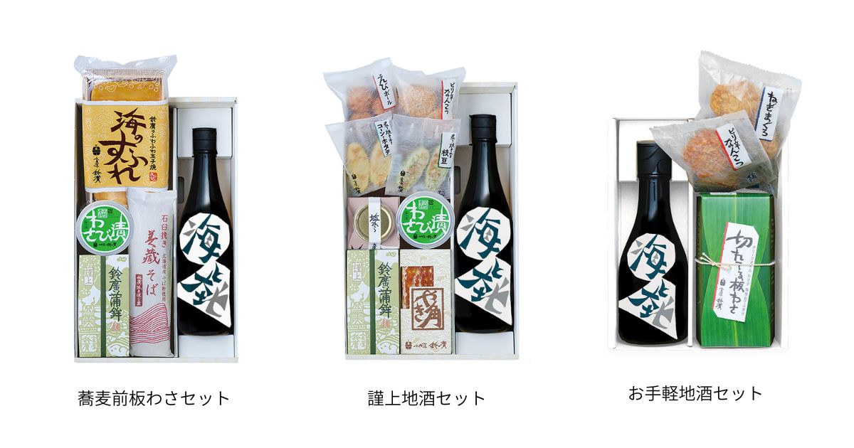 包丁いらずですぐに食べられる「お手軽地酒セット」や江戸の蕎麦前文化をご自宅で楽しめる「蕎麦前板わさセット」など、おうち晩酌にぴったりの酒とかまぼこの詰合せもご用意しております。