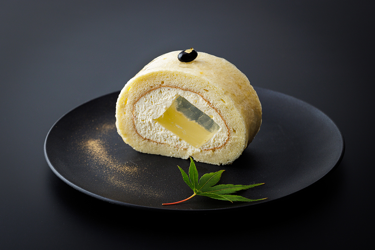 日本酒「海と大地」の透き通るゼリーを中心に、酒粕とクリームチーズ風味のクリームを米粉のふわふわしっとりしたシフォン生地でつつみました。