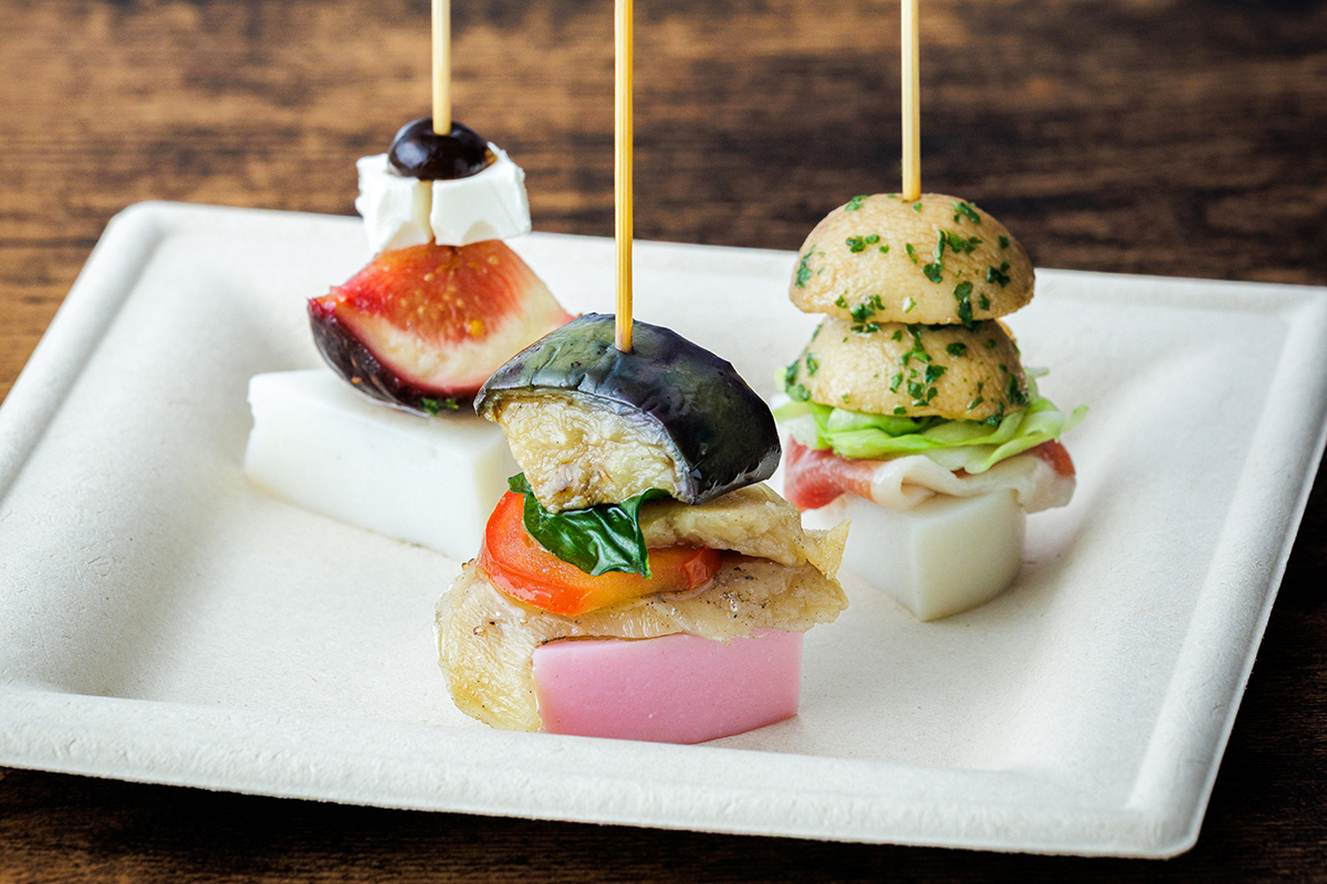 かまぼこに旬の食材を組み合わせたCAFE107の看板メニュー「かまぼこピンチョス」。