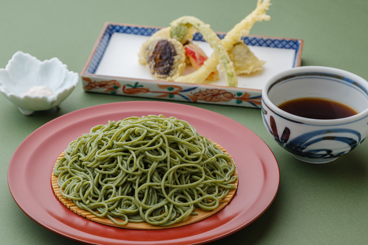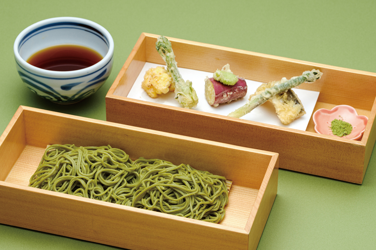 4月は蓬(よもぎ)ならではの色と香りの蓬切り。5月は丹沢大山茶のお蕎麦。季節の天ぷらと一緒にお楽しみください。