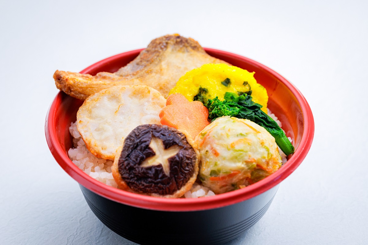 かまぼこむすびは、人気土産のあげかまと青のりを使用した出汁むすび、紅白かまぼこ、わさび漬け、海のすふれ、昆布佃煮を組み合わせたお弁当です。かまぼこむすびに使用されている「あげかま」は、鈴廣のお土産人気NO.1商品。かまぼこのすり身を上質な米油で揚げたあげかまと、鈴廣オリジナルの鰹昆布出汁を使用したおむすびは、噛みしめるごとに素材の旨味や味わいを楽しむことができます。「とうもろこし」「糸唐辛子」「グリンピース」の3種類のトッピングを彩り、見た目も華やかに仕上げました。