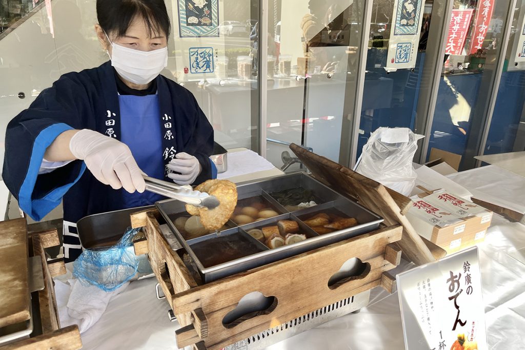 パキッと、ぷりぷりジューシー「焼きシーフランク」、おでん、甘酒、蒸しまんじゅうなど温かい軽食をどうぞ。