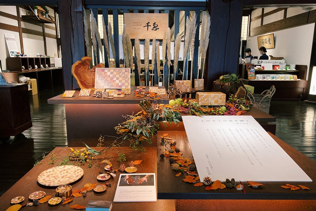 太田木工さんの作品と紅葉や実の色がつながっていくような秋の森の移ろいをイメージしたディスプレイでみなさまをお迎えしています。