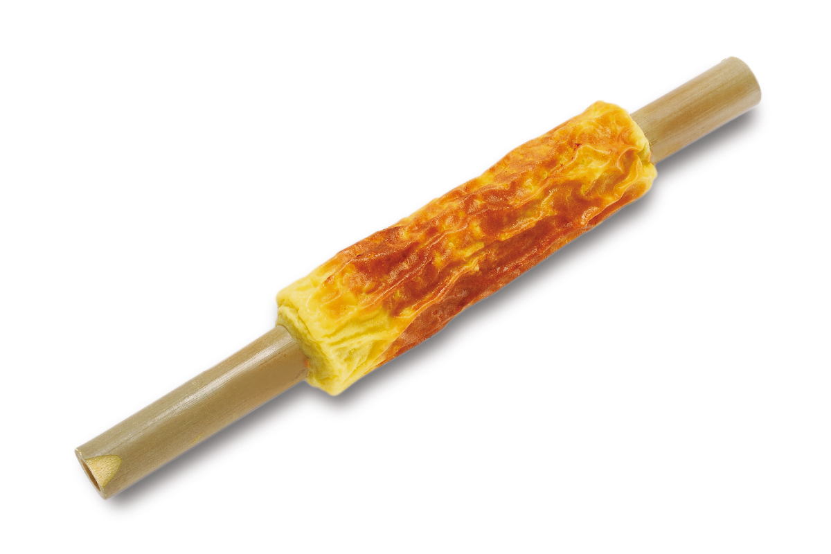 薄くのばして長方形に整えたすり身を、かまぼこ包丁を使ってクルクルと竹の棒に巻き付けていきます。一見難しそうですが、棒と包丁を同じ速さで動かせば綺麗に巻き付けることができます。