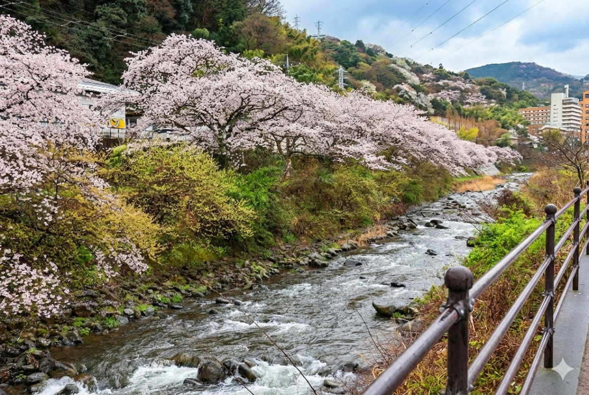 湯河原町と熱海市の県境を流れる千歳川沿いは、春になるとやわらかな桜色に包まれます。川沿いに連なる桜並木は壮観で、川面に映る花と水のせせらぎが心地よく響き合い、散策しながらゆったりとお花見を楽しめるのが魅力です。