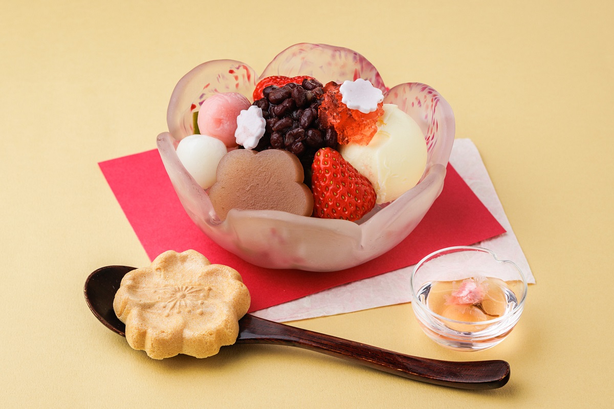 定番あんみつに桜羊羹、桜葉入りミルクジェラート、リンゴジュレ、桜の形の最中を添えた春限定の一品。