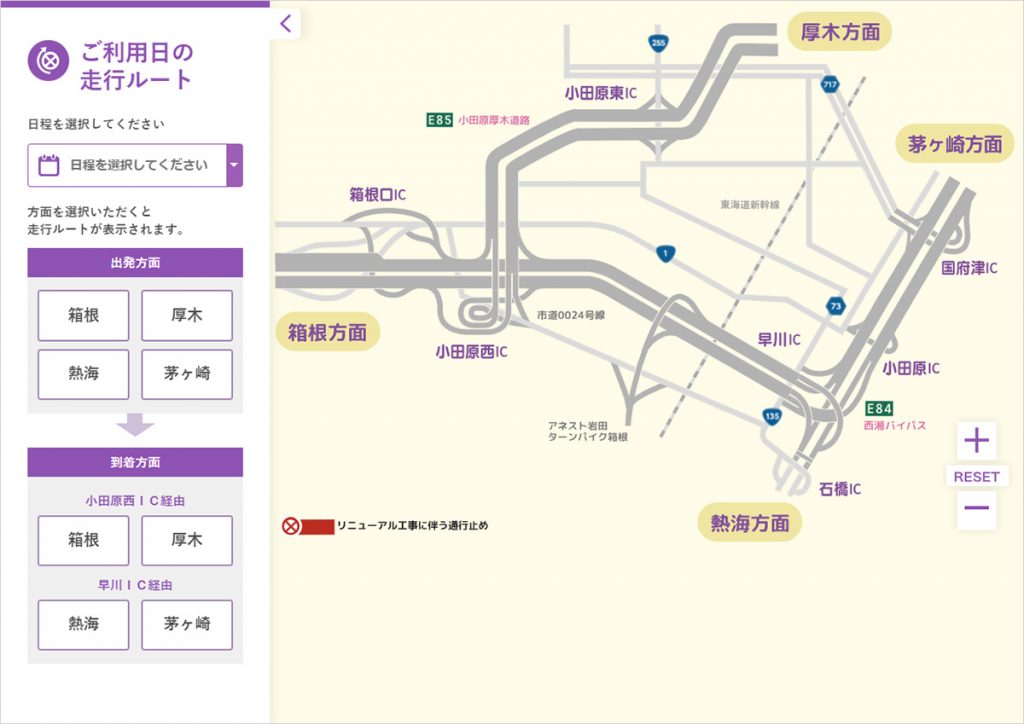 そのため、NEXCO中日本では、小田原厚木道路または西湘バイパスを経由する場合の通行止め区間を考慮した、ご利用日の走行ルートのご案内しています。