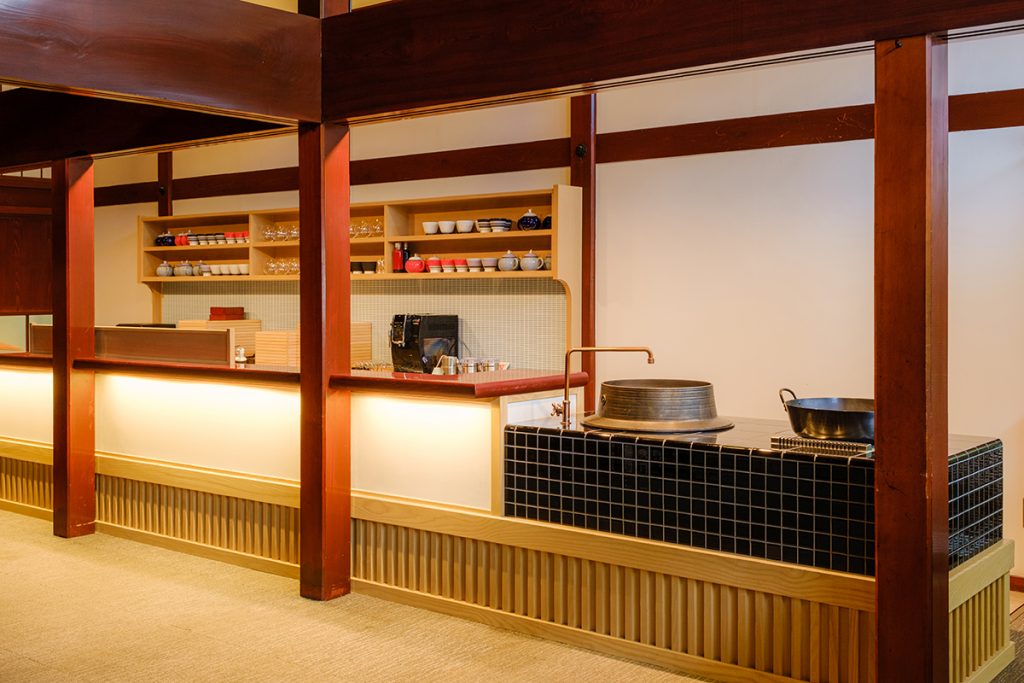 且座では、抹茶を石臼で挽き、ほうじ茶をその場で焙煎し、おくどさんの上で箱根百年水の湯を沸かせ、香り高き一服をお淹れします。