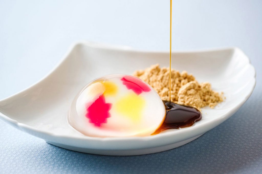 且座から臨むお庭をイメージした甘味。名水仕込みの寒天とアイスクリーム、そして鈴廣のふわふわ玉子焼き「海のすふれ」が甘みのアクセントとなり口の中で絶妙に溶け合います。