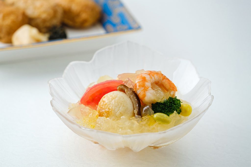 おでんの出汁をジュレにし、口に入れたときにすっと溶けるひんやりなめらかな食感に仕上げました。具材には焼き、揚げ、蒸しの3種類のかまぼこ、えび、いかなどの魚介類、うずらの卵、枝豆、椎茸、銀杏を取り入れ、素材の旨みと出汁ジュレが絶妙に合わさります。
