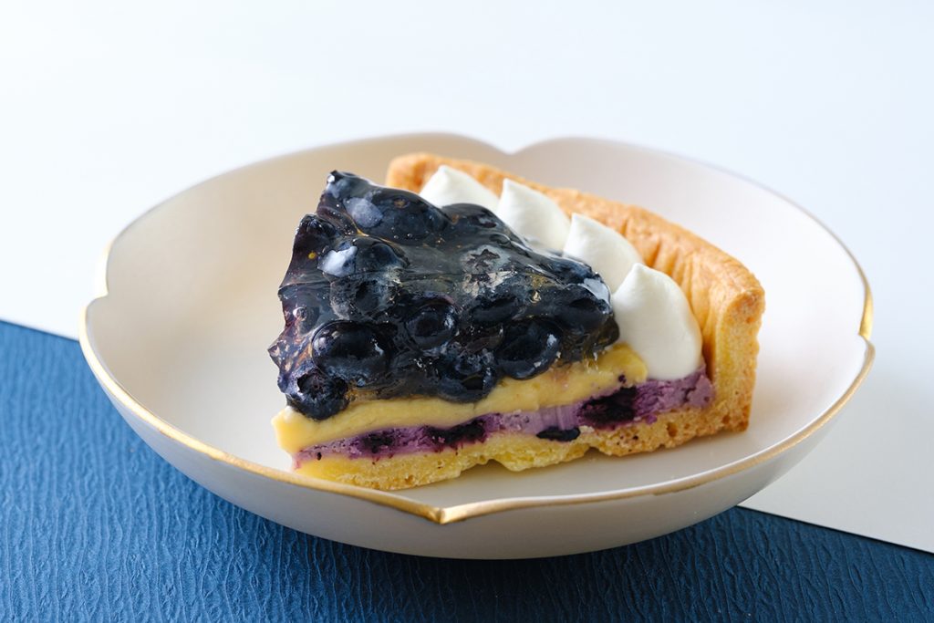 「ブルーベリーのタルト」はサクッと焼き上げたタルト生地に濃厚なチーズケーキを重ねて焼き、カスタードクリームを敷きます。そして仕上げには大粒の果実をぎっしりと並べます。ナパージュで仕上げたブルーベリーは、ぷりっと艶やか。ベイクドチーズケーキにも果肉をつかっており、濃厚なチーズの風味とブルーベリーのすっきりとした甘みが絶妙に合わさります。