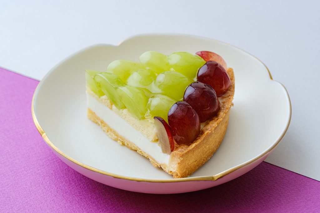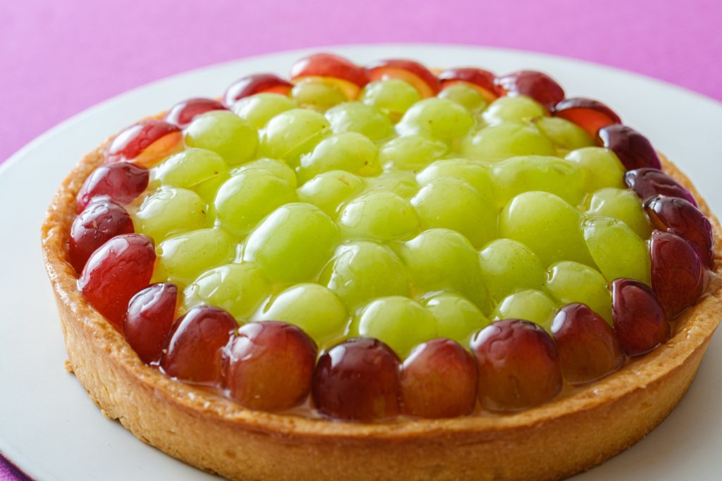 赤や黄緑色の大粒の果実を、タルトにぎっしり敷き詰めて。つやつやと煌めくぶどうの実はジューシーな果汁がたっぷりとつまっています。