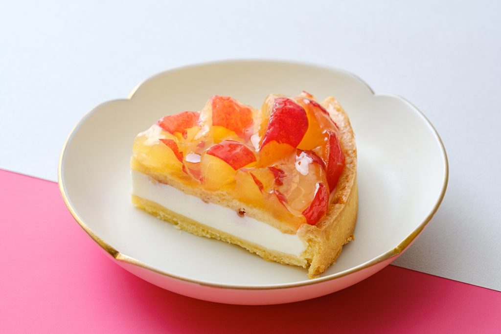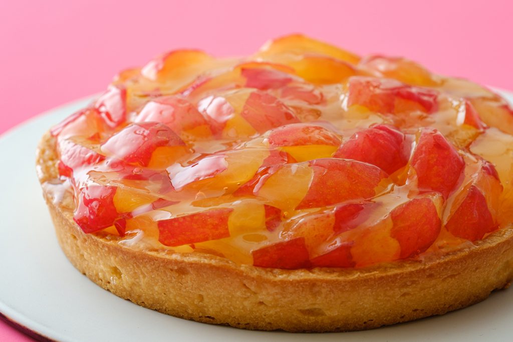「ネクタリンのタルト」は、サクサクのタルト生地にラズベリーソースを混ぜたレアチーズムースを重ね、その上に瑞々しいネクタリンを飾ります。ネクタリンは皮つきのまま使用するので、ジューシーな赤と黄のコントラストが目にも鮮やか。