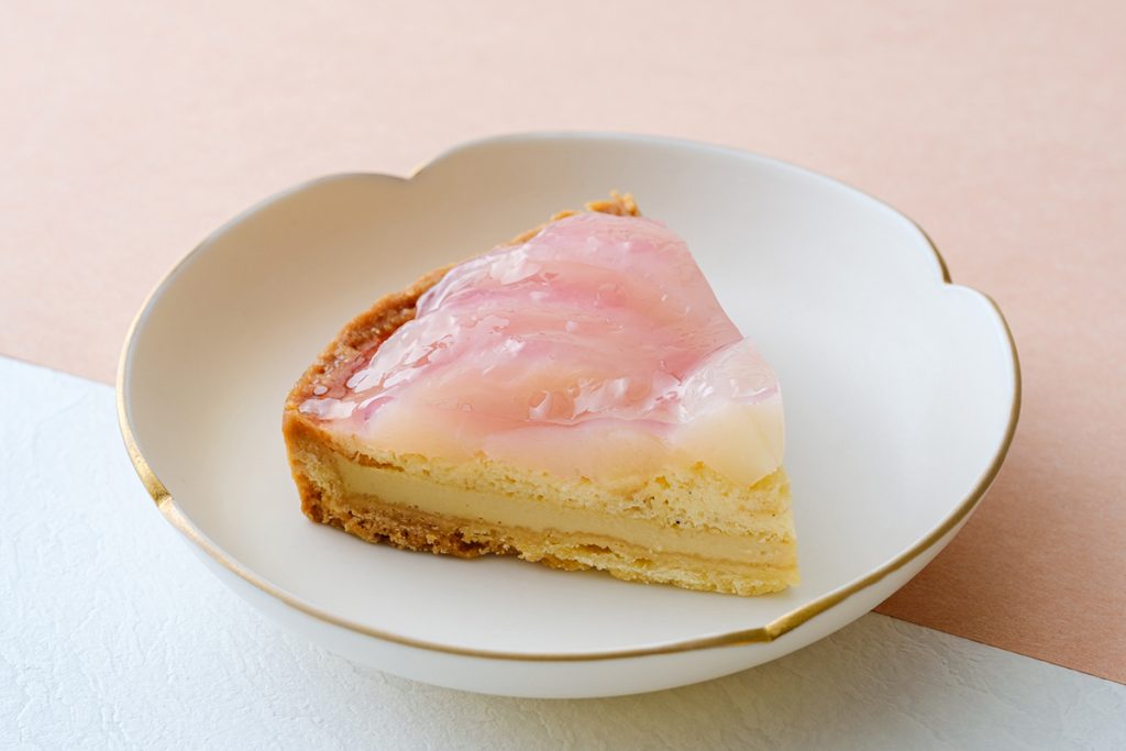 みずみずしく、香りも甘みもピークを迎える旬の桃をケーキに閉じ込めたい。そんな想いで、フレッシュな桃の甘みを堪能できるタルトをおつくりしました。