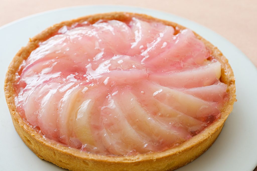 さっくりとした生地の上にカラメルプリン生地を流し込み焼き上げます。さらにその上にカスタードを敷き、白桃をぎっしりと敷き詰めて飾ります。最後にグロセイユで色をつけた柔らかなピンク色のナパージュで、可愛らしく仕上げます。