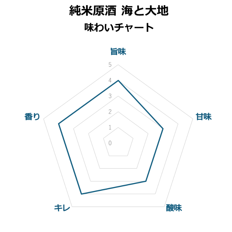 酒米ではない食用米から作る日本酒は雑味を抑えるのが難しいとされていますが、「海と大地」は発酵工程を低温でゆっくりと行うことで雑味のないクリアな味わいに仕上げております。口当たりはやわらかく、すっと引いていくキレの良さが特長で、食中酒としてはもちろん、様々なシーンでお楽しみいただけます。