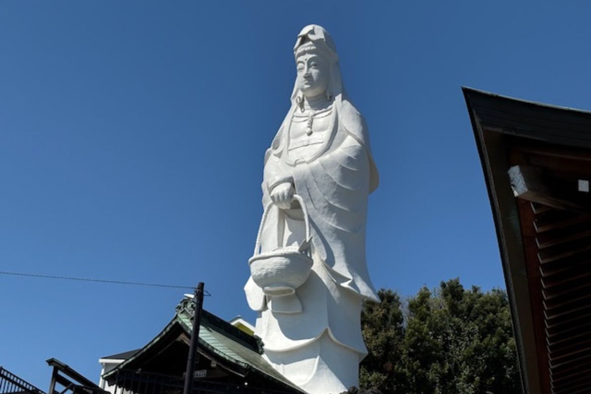 海を見守るように立つ魚藍観音は、早川のまちの印象的な風景のひとつ。魚籠を手にした珍しい観音像で、漁業や航海の安全、大漁への願いが込められています。