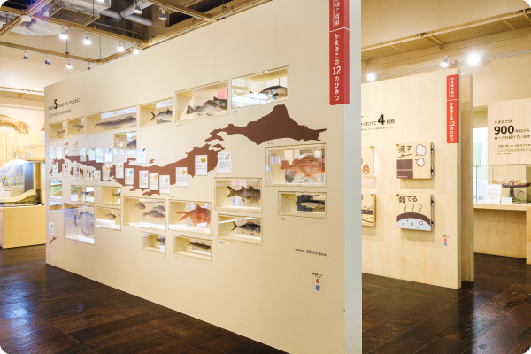 かまぼこ職人や職人が使う道具のことなど、かまぼこにまつわる知っていただきたいヒミツを展示しています。豆知識も集められます。