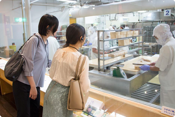 かまぼこ工場をガラス越しで見学します。ここでは新鮮な魚からつくったすり身を板につけてかまぼこの形をつくっていきます。