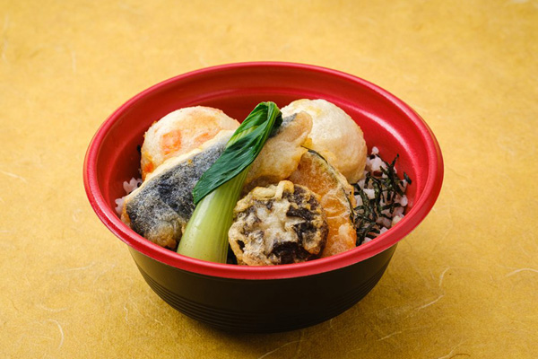 小田原産の米で炊いたご飯の上に、かまぼこの天ぷら、旬の野菜や魚をすり身の衣で揚げた天ぷらを乗せた天丼