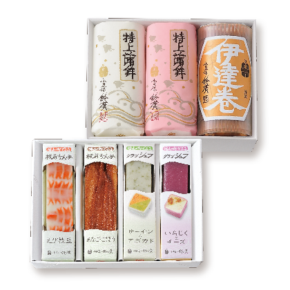 おめでたい日には食卓にいろどりを。「特上蒲鉾」紅白と、伊達巻ハーフの定番品に加えて、見た目も鮮やかな海山おーどぶる「板前ちんみ」2種「グランシェフ」2種、海の幸を堪能出来る取り揃え。