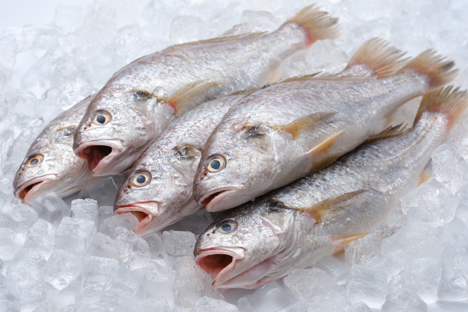 魚種ごとに味、弾力や食感も異なるため、グチ、ムツやオキギスなど様々な種類の魚を使用します。小田原かまぼこの代表、板付き蒸しかまぼこは、主にグチを使用し一本に約7匹の魚を使います。